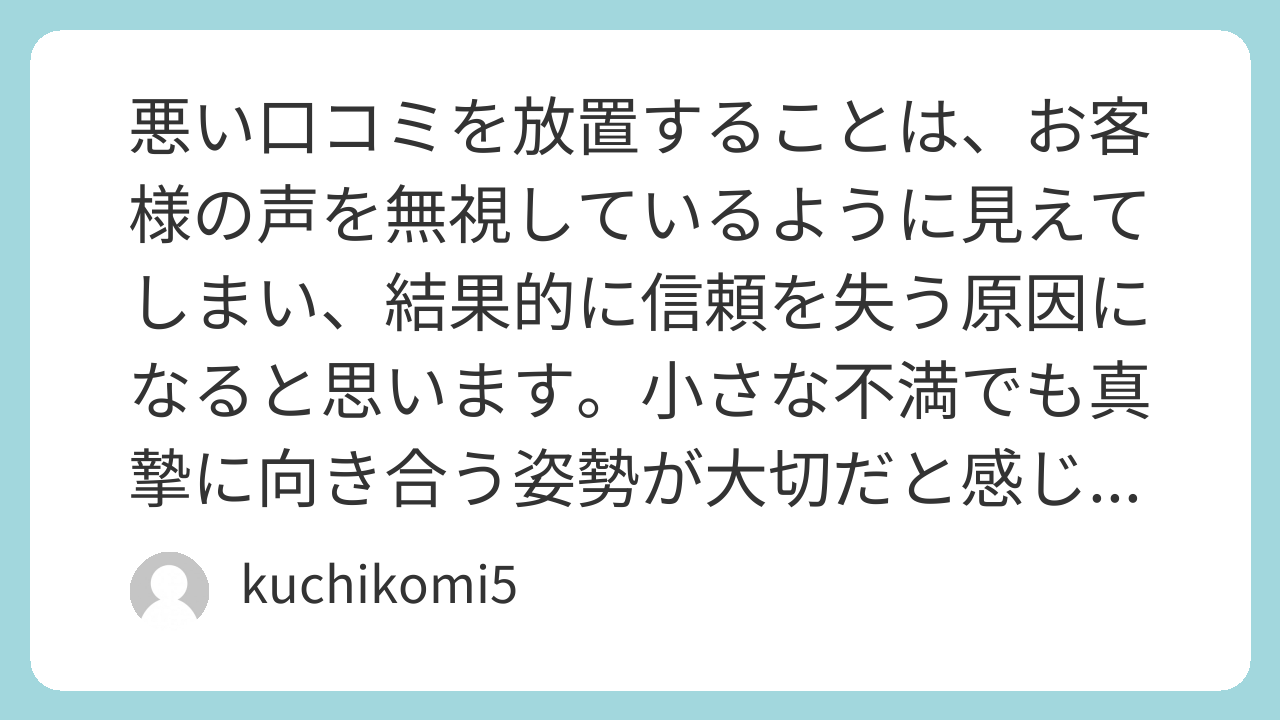 <①経営者へのメッセージ> 悪い口コミを放置することは、サイレントカスタマーを増やすだけでなく、その裏にいる何十人もの潜在的な顧客を失っていることに気づいてください。批判は「改善のヒント」であり、無視は「拒絶」と同じです。