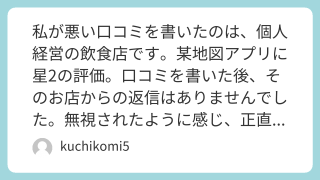 業種は「歯科医院」某地図アプリに投稿。1ヶ月以上経過しても返信や対応は一切ありませんでした。完全に放置されたことで、「患者一人ひとりの意見を大切にしない、殿様商売のクリニックなのだ」という確信が強まりました。周囲の友人や家族が「あの歯医者はどう?」と聞いてきた際には、口コミに書いた内容をより詳しく話し、「絶対に行かないほうがいい」と強く止めるようになりました。