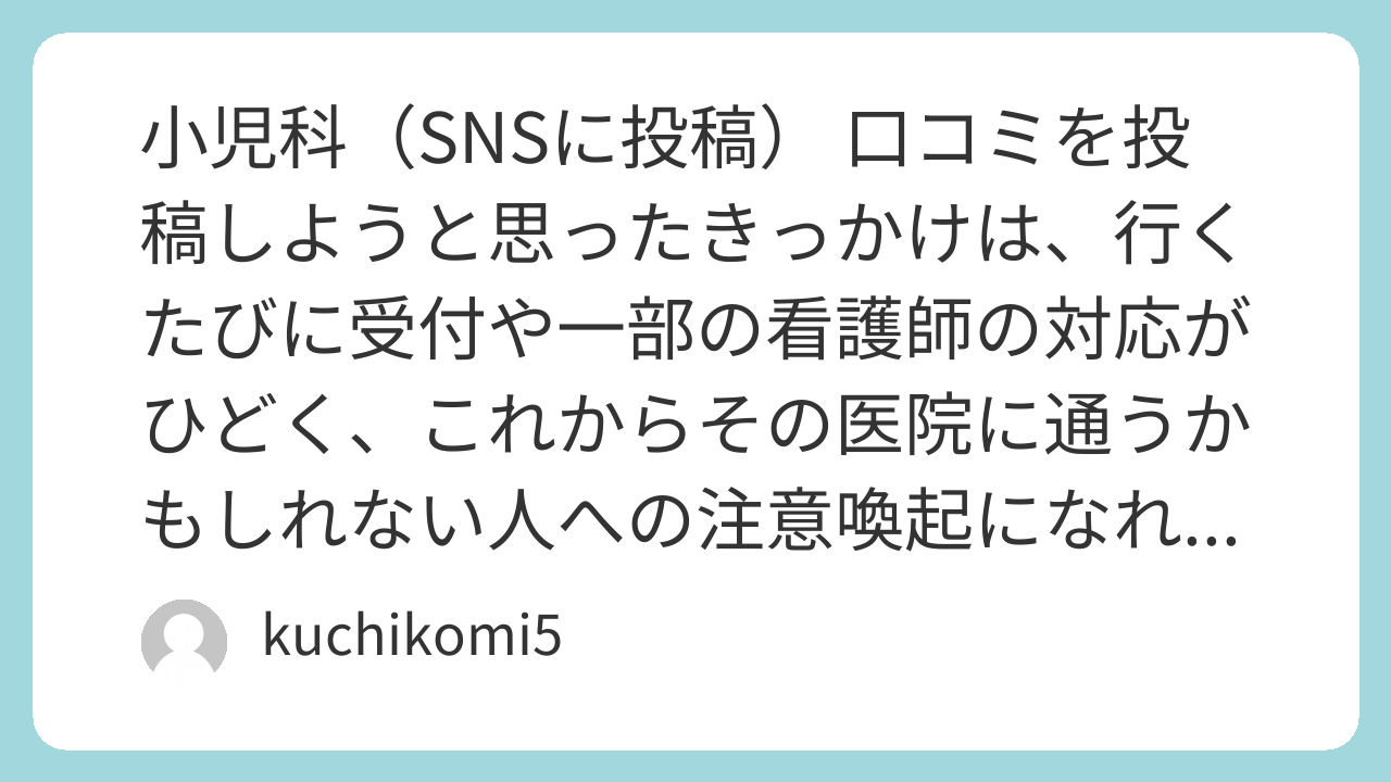小児科(SNSに投稿) 口コミを投稿しようと思ったきっかけは、行くたびに受付や一部の看護師の対応がひどく、これからその医院に通うかもしれない人への注意喚起になればと考え投稿することにした。 クレームを入れるにしても、その受付を介して電話で伝えるしか方法がなかったので、直接クレームを入れることはしなかった。 直接言えなかったのは、感情的になってしまう恐れと思っていることをきちんとまとめて伝えられる自信がなかったため。